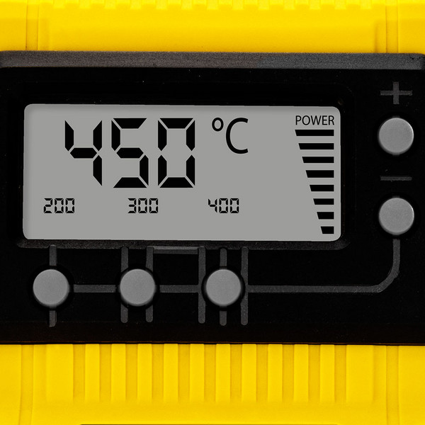 The compact base station with its easily accessible on/off switch, storage compartments for solder and soldering tips as well as an easily accessible control panel with a digital LC display provides the digital centrepiece of this soldering station. You can conveniently three temperature levels at the touch of a button and make fine adjustments in steps of 10 °C. When switching the station on, it will always start with the temperature setting used last.