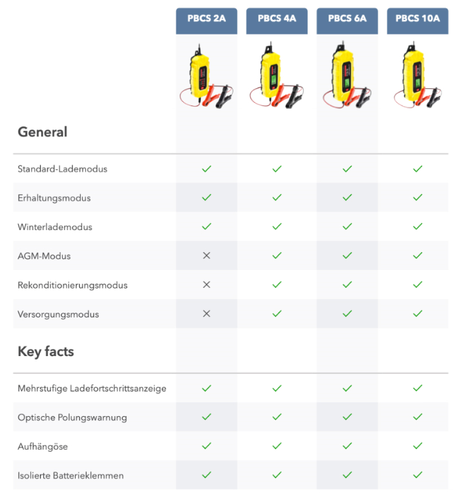 Die Erhaltungsladefunktion schützt und schont die Batterie für einen dauerhaften, idealen Ladezustand. Damit ist das PBCS 2A auch sehr gut für Saisonfahrzeuge mit langen Standzeiten geeignet und schützt deren Batterien vor Tiefenentladung.